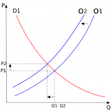 Las empresas habiendo observado una retracción en el consumo deciden reducir y/o postergar su producción y consecuentemente la curva de Oferta (O) se desplaza de O1 a O2 encontrando un equilibrio en P2, que es nivel de precios mayor que P1.